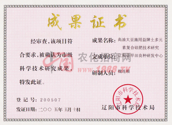 證書名稱:成果證書 發(fā)證機(jī)構(gòu):遼陽市科學(xué)技術(shù)局