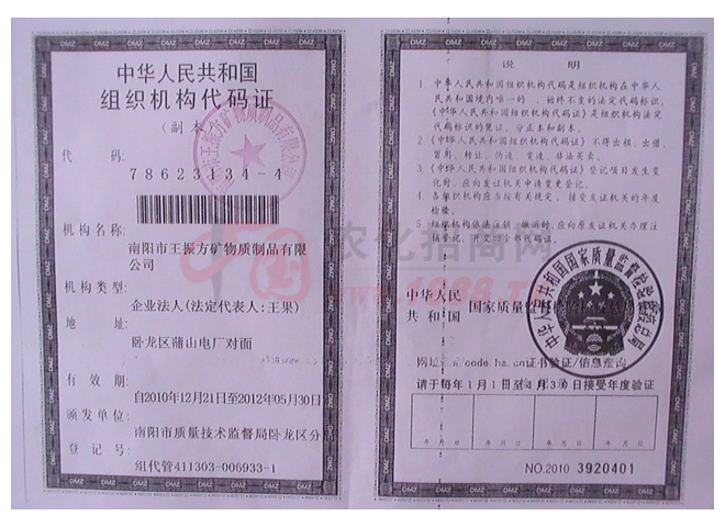 證書名稱:組織機構(gòu)代碼證 發(fā)證機構(gòu):南陽市質(zhì)量技術(shù)監(jiān)督局臥龍區(qū)分局